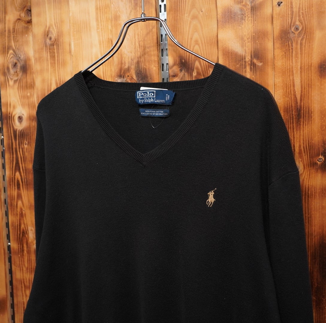 ralphlauren pima cotton Vネック ニット ブラック L/ ラルフローレン 黒 ピマコットン